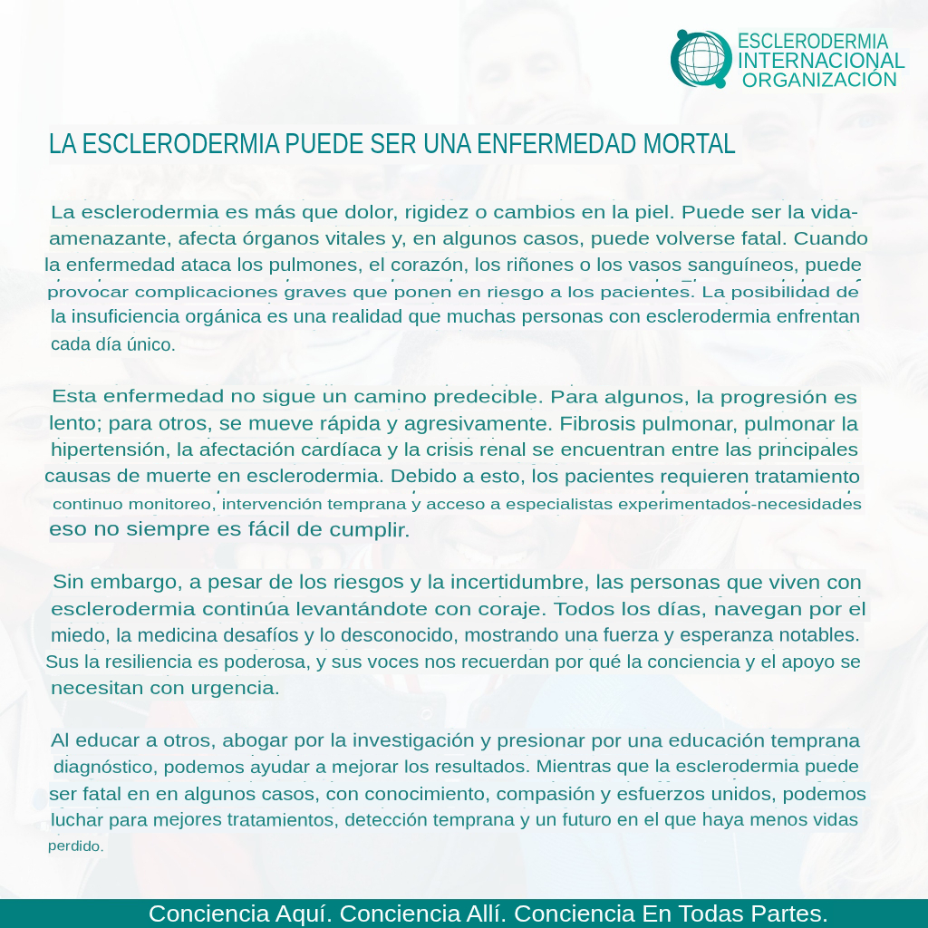 La esclerodermia es mucho más que dolor, rigidez o cambios en la piel. Puede ser mortal, afectando órganos vitales y, en algunos casos, resultando fatal. Cuando la enfermedad ataca los pulmones, el corazón, los riñones o los vasos sanguíneos, puede provocar complicaciones graves que ponen en riesgo a los pacientes. La posibilidad de insuficiencia orgánica es una realidad que muchas personas con esclerodermia enfrentan a diario.