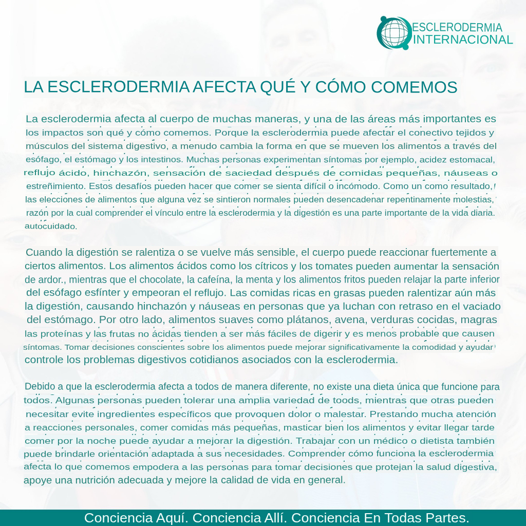 La esclerodermia afecta al cuerpo de muchas maneras, y una de las áreas más significativas es qué y cómo comemos. Dado que la esclerodermia puede afectar el tejido conectivo y los músculos del sistema digestivo, a menudo altera la forma en que los alimentos se desplazan por el esófago, el estómago y los intestinos. Muchas personas experimentan síntomas como acidez, reflujo ácido, hinchazón, sensación de saciedad después de comidas ligeras, náuseas o estreñimiento. Estos problemas pueden dificultar o incomodar la alimentación. Como resultado, las elecciones de alimentos que antes parecían normales pueden repentinamente causar molestias, por lo que comprender la relación entre la esclerodermia y la digestión es una parte importante del autocuidado diario.
