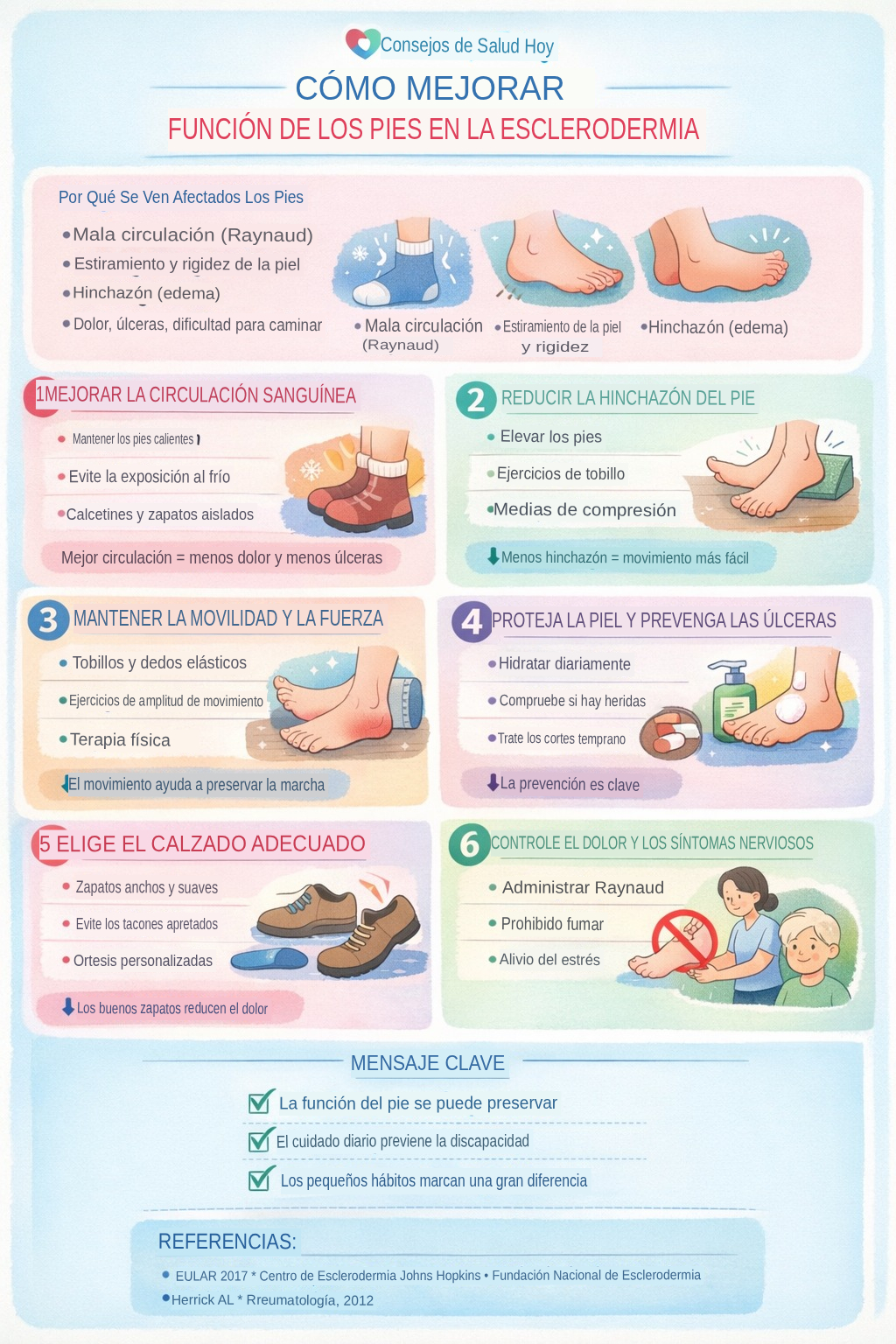 Los problemas de los pies en la esclerodermia no son cosméticos, sino que reflejan la afectación circulatoria y del tejido conectivo. La atención temprana, el calor, la protección de la piel y el seguimiento médico pueden prevenir úlceras, infecciones y discapacidad.